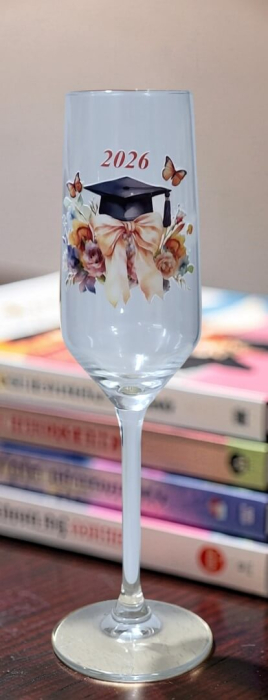 Sarbatoreste un moment special cu acest pahar rafinat pentru sampanie, creat special pentru absolventi. Realizat din sticla transparenta de inalta calitate, paharul impresioneaza prin designul sau delicat si simbolic.