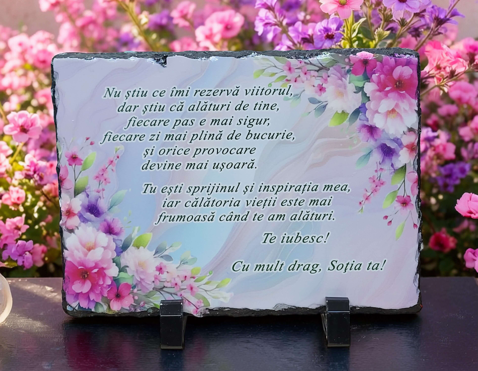 Transforma un simplu cadou intr-o declaratie de dragoste care dureaza o viata. Aceasta placa eleganta din ardezie naturala, cu dimensiunea de 14x20 cm, este imprimata cu un mesaj emotionant din partea sotiei pentru sot, fiind alegerea perfecta pentru aniversare, ziua de nastere, Ziua Indragostitilor sau pur si simplu pentru a spune „Te iubesc”.